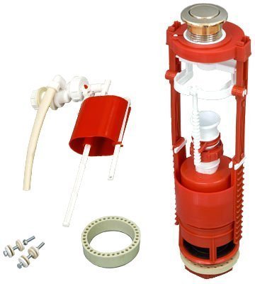 Арматура универсальная с боковой подводкой воды ,кнопка металлизированная,двухуровневый слив воды.Может применяться как в "низких" (высота до крышки бачка 270 -280 мм) ,так и высоких (высота до крышки бачка до 425 мм).Донный клапан,выполненный из резины,обеспечивает плотное запирание смывного отверстия.Наличие переливного устройства исключает нежелательный пролив воды из бачка.